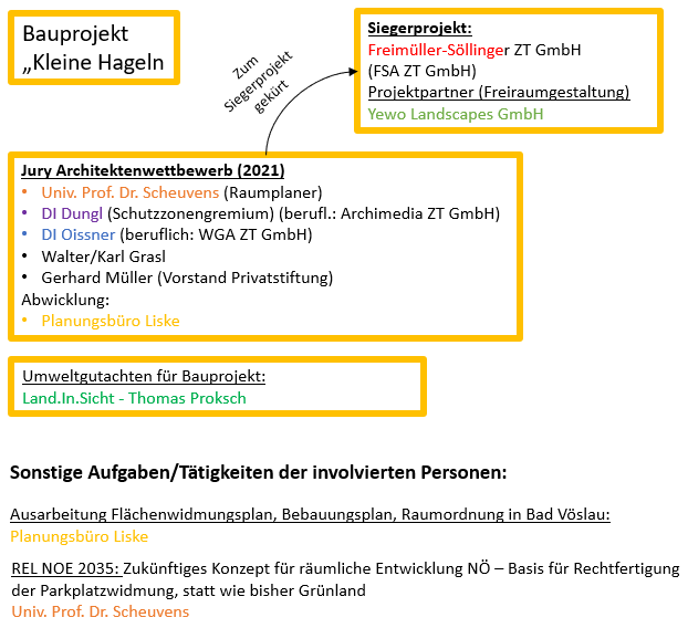 Gemäß unserer Auffassung hätte eine genaue Prüfung einer etwaigen Kollision zwischen politischen, außerpolitischen und freundschaftlichen Tätigkeiten bei dem Bauprojekt „Kleine Hageln“ die Befangenheit mancher Akteure aufzeigen müssen und hätten diese von ihrer Amtstätigkeit absehen müssen. [1]