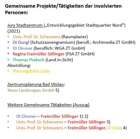 4) Univ. Prof. Dr Scheuvens – Freimüller Söllinger – DI Liske: Gemeinsam in Jury in Architektenwettbewerb unter der Leitung von DI Liske: https://www.wettbewerbe.cc/singleview/article/bautraegerwettbewerb-wien-23-meischlgasse