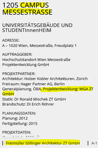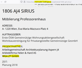 | „Entgegen der Recherche der Bürgerinitiative hat es keine Zusammenarbeit bei dem Projekt Aspern J4 (Sirius) gegeben. Dieses Projekt haben wir in einer Arbeitsgemeinschaft mit dem norwegischen Architekturunternehmen „Helen & Hard“ realisiert.“ | Auf der Homepage der FSA ZT GmbH wird jedenfalls die WGA ZT GmbH als Projektpartner angeführt. https://www.freimueller-soellinger.at/projektdetail/1806-aj4-sirius/ ![]() |