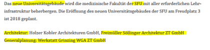 „Entgegen der Recherche hat es keine Zusammenarbeit bei dem Projekt „Neues Universitätsgebäude der SFU“ gegeben. Diese war ausschließlich beim Projekt „Campus Messestraße“ gegeben, bei welchem ebenso ein Universitätsgebäude der SFU realisiert wurde.“ | Sowohl beim Bauprojekt „Neues Universitätsgebäude der SFU“ und „Campus Messestraße“ dürfte es es eine Zusammenarbeit/ Projektpartnerschaft gegeben haben, wie aus den folgenden Quellen hervorgeht: ![]() https://www.freimueller-soellinger.at/projektdetail/campus-messecampus/ https://www.sfu.ac.at/de/news/das-neue-universitaetsgebaeude-der-sfu/ |